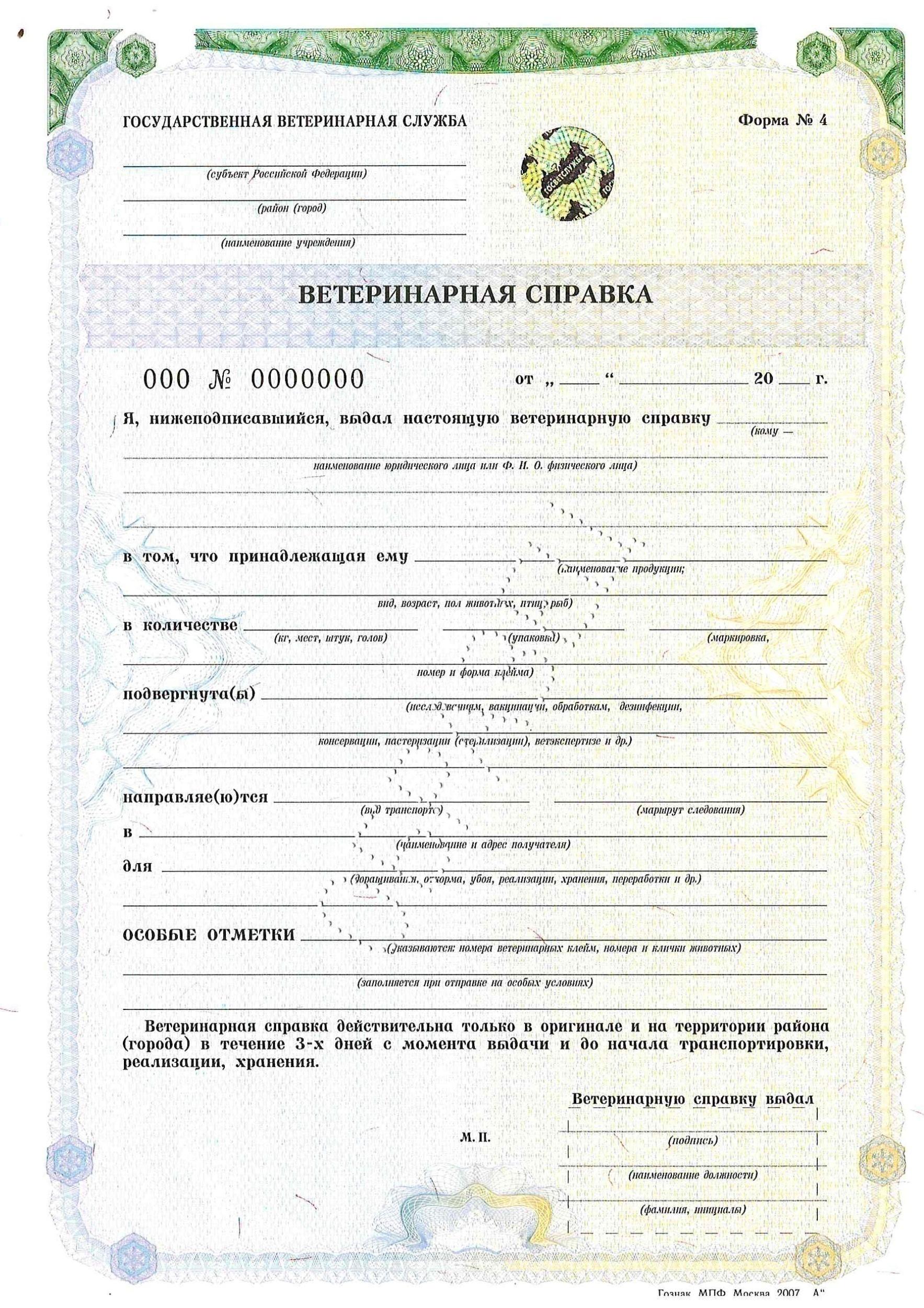 Ветеринарная справка формы №1 — это официальный документ, подтверждающий здоровье животного при его перевозке внутри страны. Данный сертификат необходим при транспортировке питомца железнодорожным, авиа- или автомобильным транспортом, а также при посещении выставок, соревнований или при переезде на новое место жительства с животным.